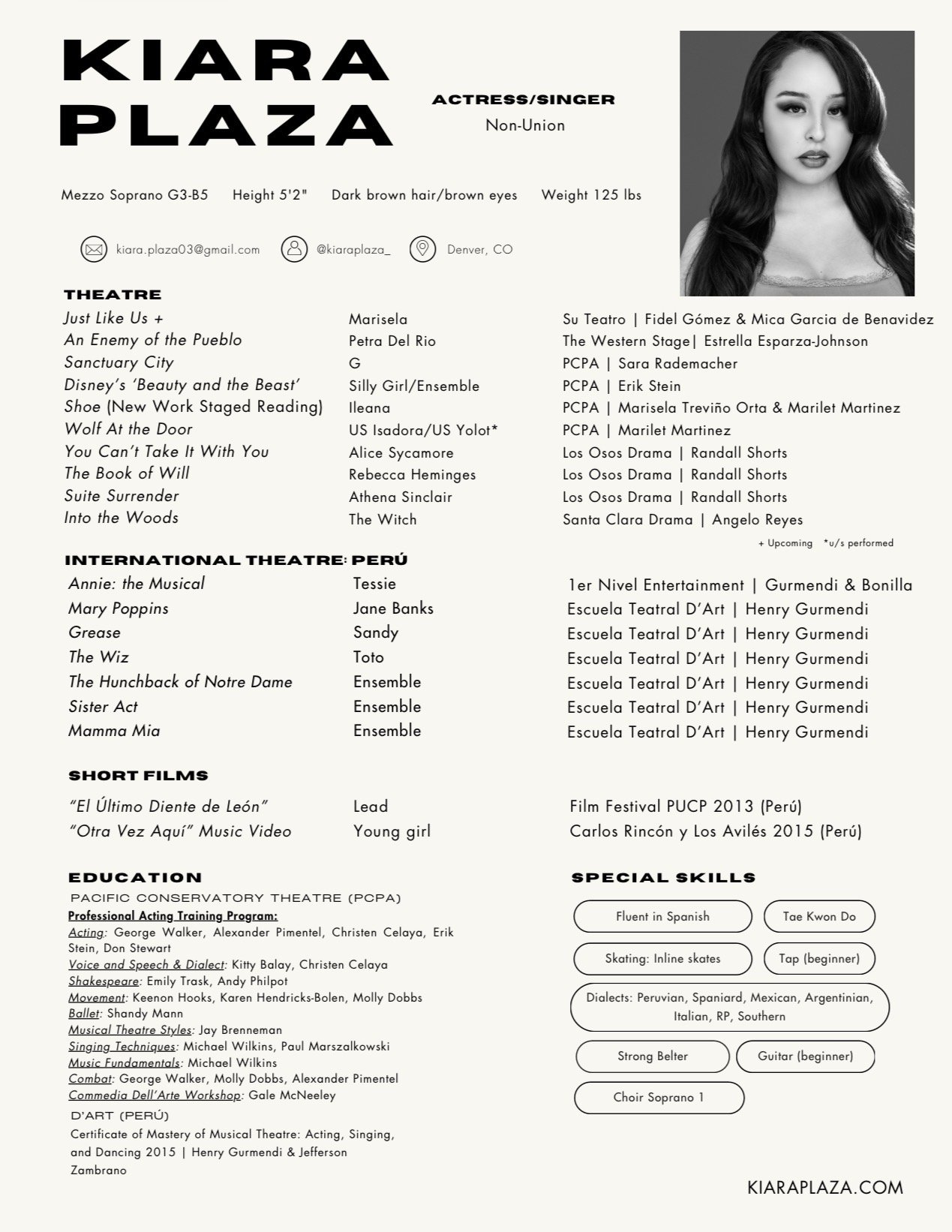 Kiara Plaza is a versatile bilingual actress and singer. She is known for her ability to play with text, elevate it and display it with sometimes unexpected emotions always rooted in truth. She is very passionate about free expression of the human experience in this current world through her art. She believes theatre is a very powerful tool to change lives for the better; to make this imperfect world a better place, one step —or play— at a time.