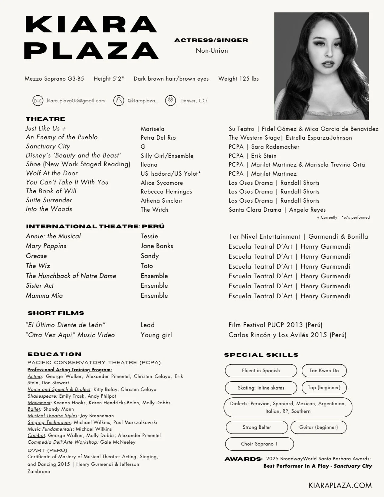 Kiara Plaza is a versatile bilingual, moving actress and singer. Having had classical theatrical training, Kiara always strives for her work to be rooted in truth. That is the most important thing to her. To make any project she is in, the most authentic to her as possible. She is not afraid to get ugly and go to raw places if that’s what the story demands. She wants to be a voice for her brothers and sisters of this earth through her God-given gift. She believes theatre is a very powerful tool to change lives for the better; to make this imperfect world a better place, one step —or play— at a time.
